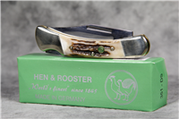 4 inches closed, 7 inches open. Made in Germany. Master blade front tang: H&R logo plus 'Solingen Germany'. Master blade rear tang: 'Bertram Cutlery 313DS'. Secondary blades front tangs: H&R logo plus 'Rostfrei'. Round shield with Hen & Rooster logo. Stainless steel blades. Deer Stag handle. Nickel silver bolsters. Brass liner.