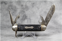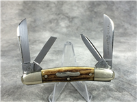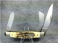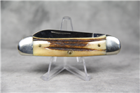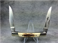 3-Blade Whittler Knife. 4 inches closed. 6-7/8 inches open. Made in Germany. Kissing Crane Logo and "ROBI KLAAS SOLINGEN" tang stamp on front of master blade. "3135XVIII" tang stamp on back of master blade. Larger Kissing Crane Logo tang stamp on secondary blade and Small Kissing Crane Logo with "GERMANY" tang stamp on other secondary blade. Master blade etched "UNRIVALED QUALITY ORIGINAL SOLINGEN" with Kissing Crane Logo. Federal Shield with Red Kissing Crane Logo shield. Stag handle. Nickel Silver bolsters. Brass liner.