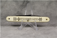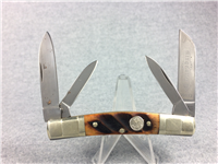 3-Blade Stockman Knife. 3-3/4 inches closed. 6-1/2 inches open. Made in Germany. German Bull logo, "7043", and "SOLINGEN GERMANY" tang stamps. Crest shields on front and back etched with German Bull logo on front and 2 check marks on back. Master blade etched "SCHMIDT & ZIEGLER STOCK KNIFE 'EL TORO' ". Smooth egg shell colored handle. Nickel Silver bolsters. Brass liner.