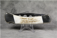 Serial # 86924. 4-1/8 inches closed. 7-1/4 inches open. Made in Germany. 'Remington UMC Made in Germany' tang stamp. Circle Remington shield. Stainless Steel blades. Delrin Stag handle. Nickel Silver bolsters. Brass liner. With original box.