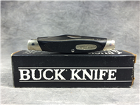 4 inches closed. 6-7/8 inches open. Made in USA. "BUCK 301 T U.S.A." tang stamp. Hammer & Blade shield. Stainless Steel blades. Black injection-molded handle. Nickel silver bolsters and liner. With original box and paperwork.