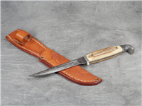 Fixed Blade Hunting Knife. 13 inches long. "WESTERN BOULDER, COLO., U.S.A." and "L46-8" tang stamps. Stainless Steel blade. Stacked leather handle. Brass guard. With leather sheath.