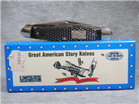 2-Blade Limited Edition Jack Knife. One of a 12 piece series of knives made to celebrate America's Bicentennial. 4 inches closed. 7 inches open. "BOKER U.S.A.", "1779" with tree logo, and serial # "12758" tang stamps. Shield features the Lafayette Escadrille. Black synthetic handle. Carbon steel blades. Master blade etched "WAR TO END ALL WARS". Nickel Silver bolsters. Brass liner. With original box and paperwork.
