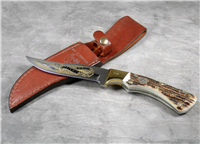 Fixed Blade Knife. 1990 Limited Edition NKCA Club Knife #1113 of 1500. 9-1/4 inches long. Hen & Rooster logo over "SOLINGEN GERMANY" and "BERTRAM CUTLERY 552 DS STAINLESS" tang stamps. Round NKCA shield. Stainless Steel blade etched "1 of 1500 NKCA 1990". Stag handle. Brass bolsters; front bolster etched with serial #1113. With original brown leather sheath.