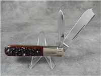 Single Blade Slimline Trapper. 4-1/8 inches closed. 7-3/8 inches open. Made in USA. "CASE XX STAINLESS USA" tang stamp. Double Oval 'Open C' CASE shield. Stainless steel blades. Red/Brown Jigged Bone handle. Nickel Silver bolsters. Brass liner.