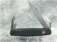 Multi-tool Utility Army Knife. 5 inches closed. 8-3/4 inches open. "Wenger Delemont Switzerland Stainless" with umbrella logo and "PAT PEND" tang stamps. Stainless Steel blades.