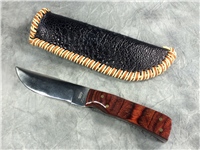Fixed Blade Knife. 4-1/8 inch blade, 8-1/4 inches overall length. High carbon stainless steel blade. "DHRussell # 3s STAINLESS" and "Grohmann Pictou NS Canada" tang stamps. Rosewood handle. With leather overlap/army sheath.