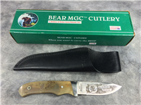 Limited Edition 1 of only 1200 made. 4-1/2 inches closed. 7-3/4 inches open. Made in Japan. "C Risner Cutlery Co." and "Star HAND CRAFTED JAPAN" tang stamps. Stainless steel blade etched with deer scene on front and "The Deer Skinner Limited Edition of 1200 made expressly for C. Risner Cutlery Co"" on back. Wood handle. Brass bolsters shaped like a deer head on one end. Front right bolster etched with serial #0983. Brass liner. With original wooden box.