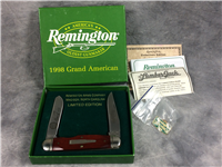 2-Blade Limited Edition Lumberjack Bullet Knife. ATA Grand American Limited Edition 1 of only 600 made. 3-5/8 inches closed. 6-1/4 inches open. Made in USA. 'Remington UMC Made in USA', 'R4468', and '1997' tang stamps. Bullet shield. Stainless Steel blades. Secondary blade etched with ATA logo and "1998 One of 600". Cocobolo handle. Nickel Silver bolsters. Brass liner. With original box and paperwork.