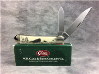 3-7/8 inches closed. 6-3/4 inches open. Made in USA. " x x x Case XX x x " (with lightning bolt S) and "USA MUSKRAT SS" tang stamps. Stainless Steel blades. Main blade etched "Merry Christmas". Natural smooth bone handle etched with image of three wise men on camels. Nickel Silver bolsters. Front right bolster etched with star. Brass liner. With original gift tin.