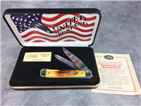 Series XV Mint Set of 8 knives in hardwood shadowbox display. Limited Edition #180 of only 250. Made in USA. " x*x CASE XX x x*x " tang stamps and corresponding model number tang stamps. Tru-Sharp Surgical stainless steel blades etched with "long-tail C" serialization. Ultra violet jigged bone handles. "CASE" bomb shields. Intricately scrolled nickel silver bolsters. Brass liners. With original 18" x 13" x 1-3/4" hardwood shadow box, collectible medallion, and certificate of authenticity attached to the back of the display.