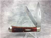 3-7/8 inches closed. 6-3/4 inches open. Made in USA. "CASE XX STAINLESS USA ***** " (5 dot), "SS", and "6347 HP SSP" tang stamps. Double Oval 'Open C' CASE shield. Stainless steel blades. Master blade stamped "TESTED XX RAZOR EDGE". Red/Brown Jigged Bone handles. Nickel Silver bolsters and liner.