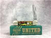 Fixed Blade Knife. 9-3/8 inches long. Made in China. "UNITED" in circle logo shield. Stainless Steel blade stamped "SPORTSMAN STAINLESS STEEL United CUTLERY" and "UC2511 Stainless Steel Handcrafted in China". Rubberized handle. Lanyard hole. With original box and black leather sheath.