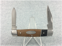 One of a 12 piece series of knives made to celebrate America's Bicentennial. 4-1/8 inches closed. 7-1/4 inches open. "BOKER U.S.A.", "1773" with tree logo, and serial # "17877" tang stamps. Shield features "Prairie Schooner" scene. Brown jigged synthetic handle. Carbon steel blades. Master blade etched "WESTWARD HO!". Nickel Silver grooved bolsters. Brass liner. With original box and paperwork.