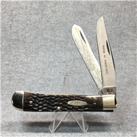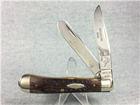 Limited Edition of 600 Smoky Mountain Knife Works 1 from the set of 3 trapper knives. 2-Blades. 4-1/8 inches closed. 7-3/8 inches open. Made in USA. "CASE XX STAINLESS U.S.A. ** " (2 dot) and "6254 SSP" tang stamps. Double oval 'open C' CASE shield. Stainless steel blades. One blade etched with a farm scene with horses and a rider. Brown jigged bone handle. Nickel Silver bolsters and brass liner. Front right bolster etched with serial.
