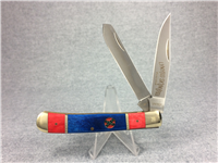 2-Blade Trapper Knife. 4-1/8 inches closed. 7-3/8 inches open. "UNITED", "(c)2010 FLY ON, INC", "UC2753 Stainless Steel Handcrafted in China" tang stamps. Stainless steel blades. Master blade etched "LYNYRD SKYNYRD SPECIAL EDITION". Red and blue bone handle with round Lynyrd Skynyrd logo shield. Nickel silver bolsters - front right bolster etched with serial #289. Brass liner. No box.