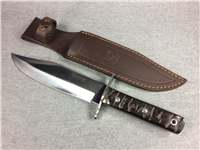 Beautiful large fixed blade bowie knife. Limited edition #055. 16-1/4 inches long. 11 inch premium 0170-6C carbon steel blade, with fine satin finish, stamped "National Living Treasure Series Jerry Fisk - Master Smith MMIII". "OVB OUR VERY BEST Camillus Cutlery Co." tang stamp. Stabilized curly maple handle. Stainless steel guard etched with serial #055. With paperwork, storage pouch, and heavy-duty brown leather slip sheath with removable frog for belt carry.