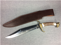 Fixed Blade Bowie Knife. Approx. 15-1/4 inches long. "WRANGLER" and "440 STAINLESS STEEL SPAIN" tang stamps. Beautiful Stag handle. With original brown leather sheath embossed with "Wrangler".