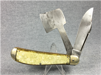 2-Blade Vintage Folding Knife. 5 inches closed. 8-3/4 inches open. Made in USA. "KA-BAR" and "UNION CUT. CO. OLEAN, N.Y. U.S.A." tang stamps. Stainless Steel blade and hatchet. Yellow 'cracked ice' handle. Nickel Silver bolsters and brass liner.