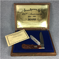 4-1/2 inches closed. 8 inches open. Made in USA. "CRAFTSMAN U.S.A.", "ANNIVERSARY ISSUE", "LTD EDITION 1986", and "95113" tang stamp. Blades etched with SEARS logo and "SEARS ROEBUCK AND CO. 1886 1986". Special "100 SEARS" logo shield. Brown jigged bone handle. Nickel silver bolsters. Front bolster etched with serial #397. Brass liner. With wooden display box and registration card.