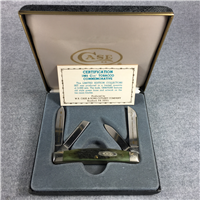 3-1/2 inches closed. 5-3/4 inches open. Limited Edition #134. Made in USA. "CASE XX ***SS*** USA" (6 dot with lightning bolt S - 1984 date stamp) and "G64052 SS" tang stamps. Double Oval 'Open C' CASE shield. Stainless steel blades; master blade etched "Case XX 1985 Tobacco Commemorative" and secondary blade etched "North Carolina BRIGHTLEAF". Old Style Green Jigged Bone handle. Nickel Silver bolsters; front right bolster etched with serial # 134. Brass liner. Comes with certificate of authenticity in a clam shell storage case embossed with "W.R. CASE 1985 TOBACCO COMMEMORATIVE" in gold lettering and a leaf symbol.