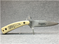 Fixed-Blade Knife. 7-1/4 inches long. Made in USA. "SCHRADE U.S.A. SC501" tang stamp. Stainless Steel blade etched "Schrade Scrimshaw". Whale tooth delrin handle scrimshawed with image of a pronghorn. No box.