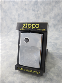 Zippo lighter manufactured in 2003. Street chrome finish over solid brass with front design. Standard size 1-7/16 inches wide by 2-1/4 inches high. Bottom of lighter reads: H Zippo 03 Bradford, PA. Made in U.S.A.