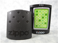 ZIPPO Green Circles lighter manufactured in 2005. Satin Chrome finish over solid brass with color printed image on front. Standard size 1-7/16 inches wide by 2-1/4 inches high. Bottom of lighter reads: A Zippo 05 Bradford, PA. Made in U.S.A.