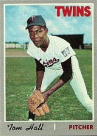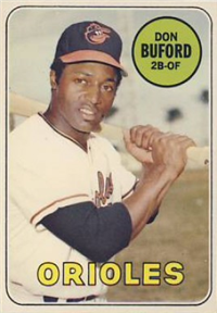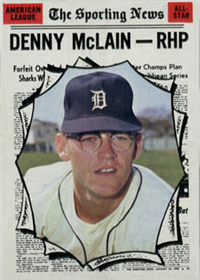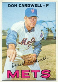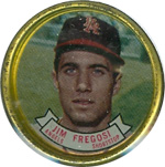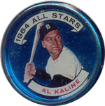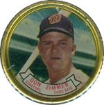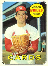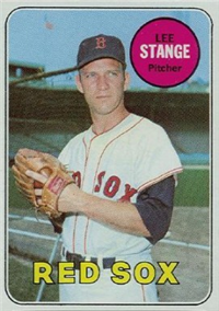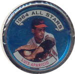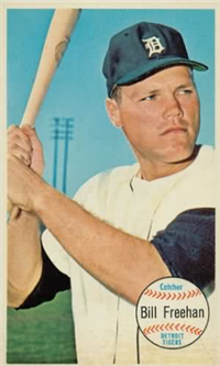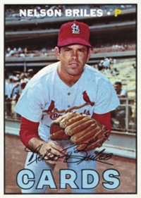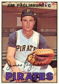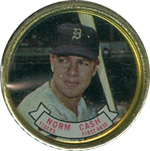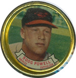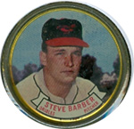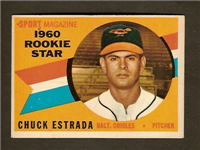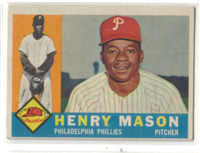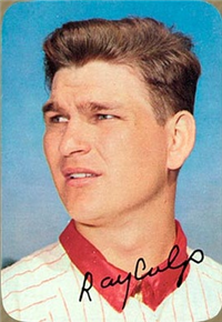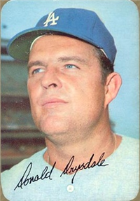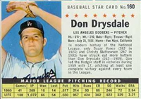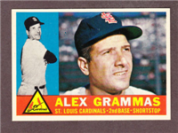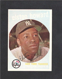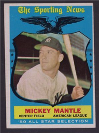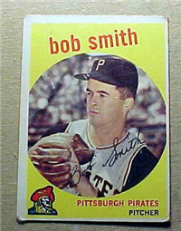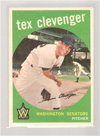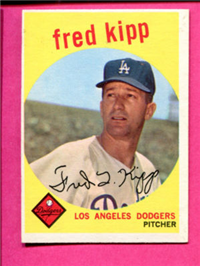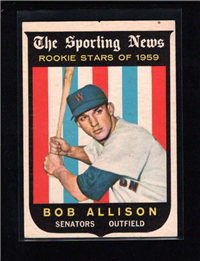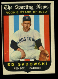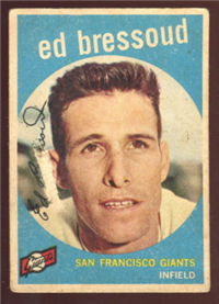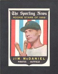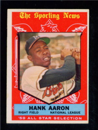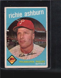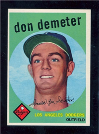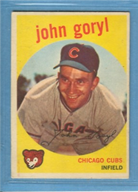 This card is one of 572 cards issued in the 1959 Topps card set--a set marking the larges tset issued to that time. The cards in this set measured 2-1/2" by 3-1/2" and they have a round photograph at the center of the front with a solid-color background and white border. A facsimile autograph is found across the photo. Card numbers below #507 have red and green printing with the card numbering white in a green box. On card numbers 507 and higher, the printing is black and red and the card number is in a black box. Specialty cards include multiple-player cards, team cards with checklists, "All-Star" cards, highlights from previous season, and 31 "Rookie Stars". There is also a card of the commissioner, Ford Frick, and also one of Roy Campanella in a wheelchair. A handful of cards can be found with and without lines added to the biographies on the back indicating trades or demotions; those without the added lines added to the rare and valuable and are not included in the complete set price. Card numbers 199 through 286 can be found with either white or grey stock being the less common.
