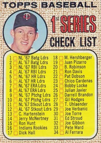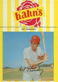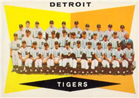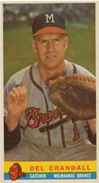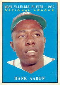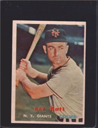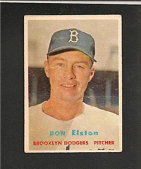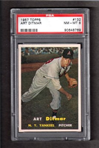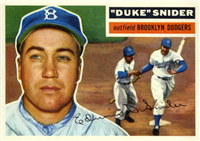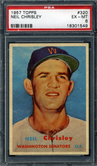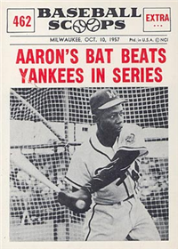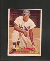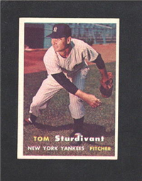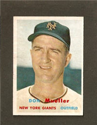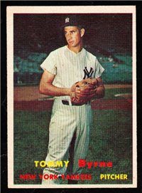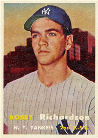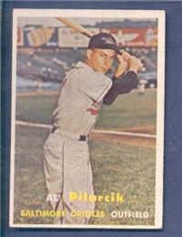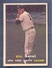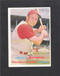 For 1957, Topps reduced the size of its cards to the now-standard 2-1/2" by 3-1/2." Set size was increased to 407 cards. Another change came in the form of the use of real color photographs as opposed to the hand-colored black and whites of previous years. For the first time since 1954, there are also cards with more than one player. The two, "Dodger Sluggers" and "Yankees Power Hitters" began a trend toward the increased use of multiple-player cards. Another first-time innovation, found on the backs, is complete player statistics. The scarce cards in the set are not the highest numbers, but rather numbers 265-352. Four unnumbered checklist cards were issued along with the set. They are quite expensive and are not included in the complete set prices quoted below.
