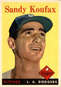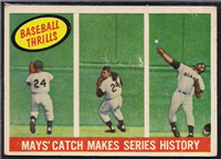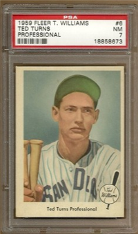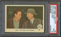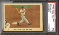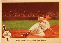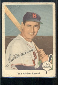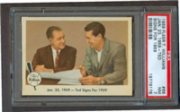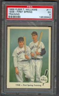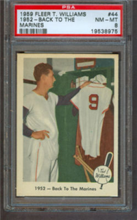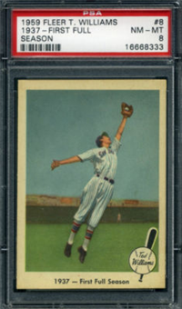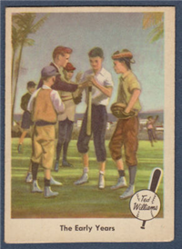 The 80-card 1959 Fleer set tells of the life of baseball great Ted Williams, from his childhood years up to 1958. The full-color cards measure 2-1/2" by 3-1/2" in size and make use of both horizontal and vertical formats. The card backs, all designed horizontally, contain a continuing biography of Williams. Card #68 was withdrawn from the set early in production and is scarce. Counterfeit cards of #68 have been produced and can be distinguished by a cross-hatch pattern which appears over the photo on the card fronts