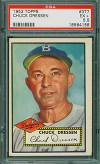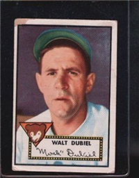 This card is one of 407 cards in the 1952 Topps set, the largest set of its day- both in number of cards and physical dimensions of the cards. Cards in this set are 2-5/8” by 3-3/4” with a hand-colored black and white photo on front. Major baseball card innovations presented in the set include the first-ever use of color team logos as part of the design, and the inclusion of stats for the previous season and overall career on the backs. A major variety in the set is that first 80 cards can be found with backs printed entirely in black or black and red. Backs entirely in black command a $10-15 premium. Card numbers 311-407 were printed in limited supplies and are extremely rare.