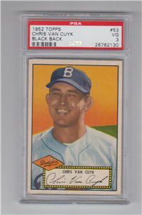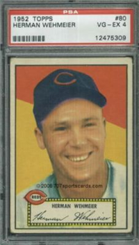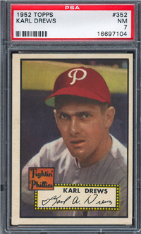 This card is one of 407 cards in the 1952 Topps set, the largest set of its day- both in number of cards and physical dimensions of the cards. Cards in this set are 2-5/8” by 3-3/4” with a hand-colored black and white photo on front. Major baseball card innovations presented in the set include the first-ever use of color team logos as part of the design, and the inclusion of stats for the previous season and overall career on the backs. A major variety in the set is that the first 80 cards can be found with backs printed entirely in black or black and red. Backs entirely in black command a $10-15 premium. Card numbers 311-407 were printed in limited supplies and are extremely rare.