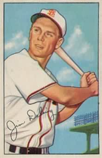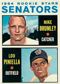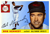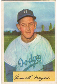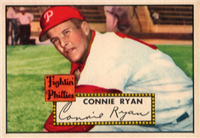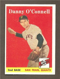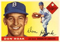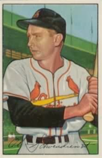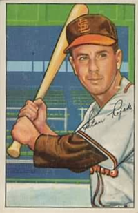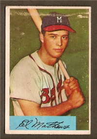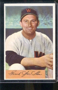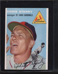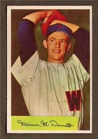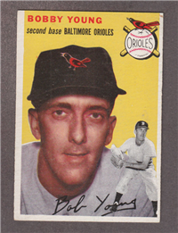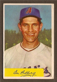 This card is one of 250 cards issued in the 1954 Topps set. This set was the first issue to use two player pictures on the front and is very popular today. Solid color backgrounds frame both color head-and-shoulders and black and white action pictures of the player. The player's name, position, team and team logo appear at the top. Backs include an "Inside Baseball" cartoon regarding the player as well as statistics and biography. The cards measure 2-5/8" by 3-3/4" and include manager and coaches cards. This was the first set to use two players together on a modern card; the players were, appropriately, the O'Brien twins.