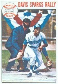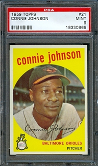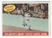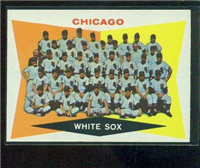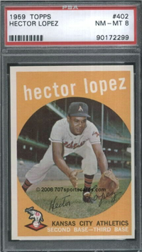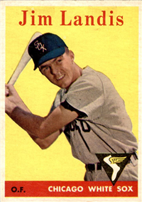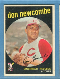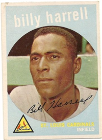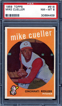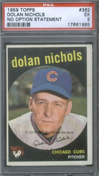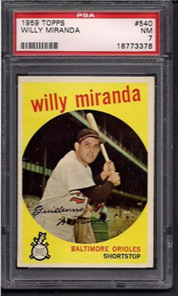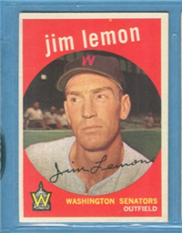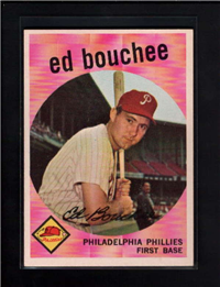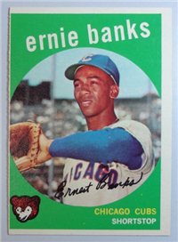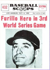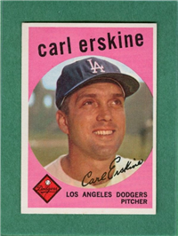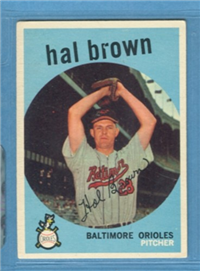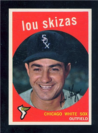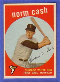 This card is one of 572 cards issued in the 1959 Topps card set--a set marking the largest set issued to that time. The cards in this set measured 2-1/2" by 3-1/2" and they have a round photograph at the center of the front with a solid-color background and white border. A facsimile autograph is found across the photo. Card numbers below #507 have red and green printing with the card numbering white in a green box. On card numbers 507 and higher, the printing is black and red and the card number is in a black box. Specialty cards include multiple-player cards, team cards with checklists, "All-Star" cards, highlights from previous season, and 31 "Rookie Stars". There is also a card of the commissioner, Ford Frick, and also one of Roy Campanella in a wheelchair. A handful of cards can be found with and without lines added to the biographies on the back indicating trades or demotions; those without the added lines added to the rare and valuable and are not included in the complete set price. Card numbers 199 through 286 can be found with either white or grey stock being the less common.