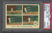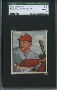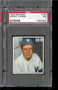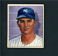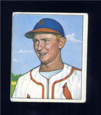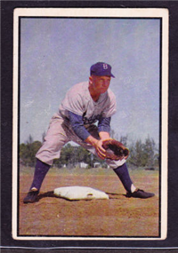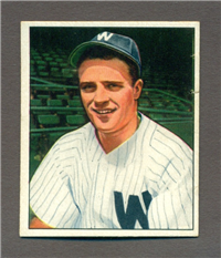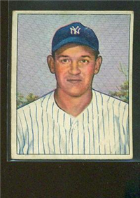 The quality of the 1950 Bowman issue showed a marked improvement over the company's previous efforts. The cards are beautiful color art reproductions of actual photographs and measure 2-1/16" by 2-1/2" in size. The card backs include the same type of information as found in the previous year's issue but are designed in a horizontal format. Cards found in the first two series of the set (#'s 1-72) are the scarcest in the issue. The backs of the final 72 cards in the set (#'s 181-252) can be found with or without the copyright line at the bottom of the card, the "without" version being the less common.