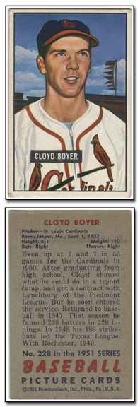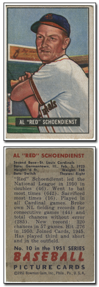 In 1951, Bowman increased the number of cards in its set for the 3rd consecutive year when it issued 324 cards. The cards are, like 1950, color art reproductions of actual photographs but now measure 2-1/16" by 3-1/8" in size. The player's name is situated in a small, black box on the card front.