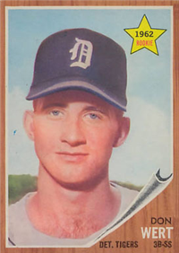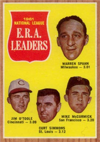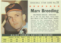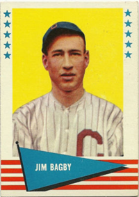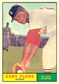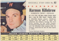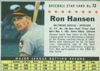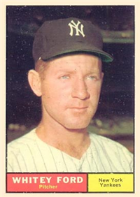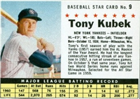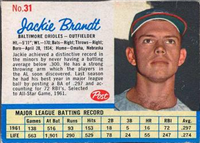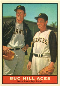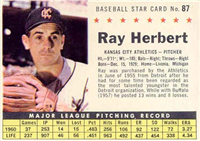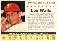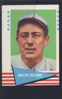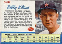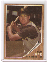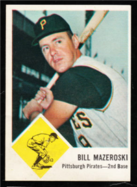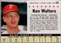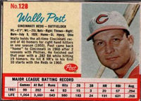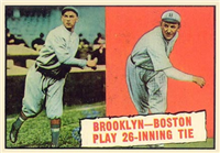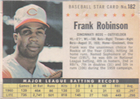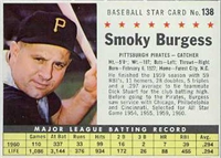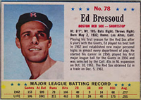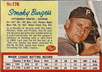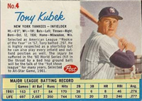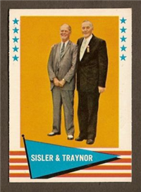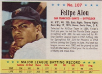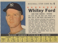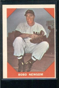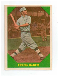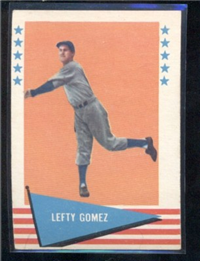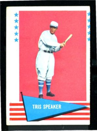 Over a two year period, Fleer issued another set utilizing the Baseball Greats theme. The 154-card set was issued in two series and features a color player portrait against a color background. The player's name is located in a pennant set at the bottom of the card. The card backs feature orange and black on white stock and contain player biographical and statistical information. The cards measure 2-1/2"by 3-1/2" in size. The second series cards (#'s 89-154) were issued in 1962.