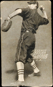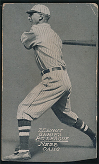 The second series of Zeenut cards measure 2 1/8" x 4 1/8" high and featured sepia-toned photographs on a brown background with no border. Most cards have blank backs, but some have been found with printing advising collectors to "save Zeenut pictures for valuable premiums." The checklist consits of 158 subjects, but more cards are still being discovered.