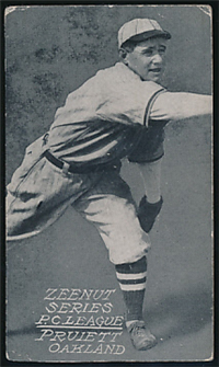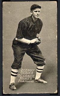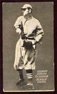 The card issued as part of the very rare "Big Eater" set, issued circa 1911. The set includes only members of the Pacific Coast League Sacramento Solons. The black and white cards are unnumbered and measure 2-1/8" by 4" and feature action photos. The lower part of the card contains a three-line caption that includes the player's last name, team designation (abbreviated to "Sac'to"), and the promotional line: "He Eats 'Big Eaters'." (Although the exact origin is undetermined, it is believed that "Big Eaters" were a candy novelty.)