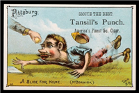 The Tobin Lithograph cards, measuring 3" by 4 1/2" were typical of the various trade cards that were popular advertising vehicles in the late 19th centuiry. Found in both black and white and color, the Tobin "lithos" include ten cards depicting caricature action drawings of popular baseball players of the 1887-1888 era. The set takes its name from the manufacturer whose name, TOBIN, NY appears in the lower right corner of each card.