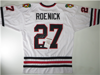 This is a size XL Chicago Blackhawks Jeremy Roenick #27 Jersey signed by Jeremy Roenick himself and authenticated by James Spencer Authentication, LLC. Everything is sewn on the jersey. It is hand-signed in silver felt tip pen. The jersey is in near mint to mint condition and is accompanied by its certificate of authenticity and hologram with matching W621714 number.