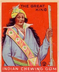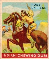A total of 216 cards are in the set, each measuring 2 3/8 inches x 2 7/8 inches. The fronts are brightly colored, and picture scenes of Native Americans and frontier heroes. There is a possible white background variation known to exist for at least some of the cards. Another variation involves the advertisement panel on the bottom portion of the card reading Indian Chewing Gum, as it is usually red but can also be rarely found in blue.