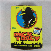 Full complete box of Dick Tracy trading cards. 36 unopened packs with 8 movie cards and 1 sticker, plus original full color box. Issued 1990 by Topps.