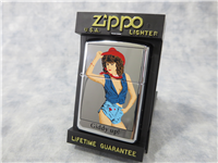 ZIPPO Nose Art Pin Up Girl lighter circa 2005. Polished Chrome finish over solid Brass. Standard size 1-7/16 inches wide by 2-1/4 inches high. Bottom of lighter reads: H Zippo 05 Bradford, PA. Made in U.S.A. Includes original, unfired insert.