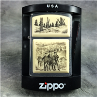 ZIPPO Totem Pole Scrimshaw lighter circa 2004. Brushed Chrome finish over solid Brass with cream Ultralite chips on the front with carved design. Standard size 1-7/16 inches wide by 2-1/4 inches high. Bottom of lighter reads: D Zippo 04 Bradford, PA. Made in U.S.A. Includes original, unfired insert.