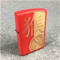 ZIPPO YEAR OF THE MONKEY Laser Etched Lighter. Matte red finish over solid brass. Standard size 1-7/16 inches wide by 2-1/4 inches high. Bottom of lighter reads: G Zippo 15 Bradford, PA. Made in U.S.A. Sealed.