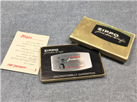 ZIPPO Hughes Aircraft Company, Electron Dynamics Division Lighter circa 1974. Polished Chrome finish over solid Brass with laser engraved, colorized front logo. Slim Size. Bottom of lighter reads: //// Zippo //// Bradford, P.A. Made in U.S.A. Includes original insert.