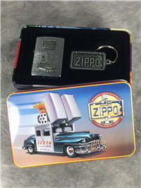 ZIPPO 1947 CHRYSLER Limited Edition Lighter and keychain set, manufactured in 1998. Brushed chrome finish over solid brass with front emblems. Standard size 1-7/16 inches wide by 2-1/4 inches high. Bottom of lighter reads: B Zippo XIV Bradford, PA. Made in U.S.A.